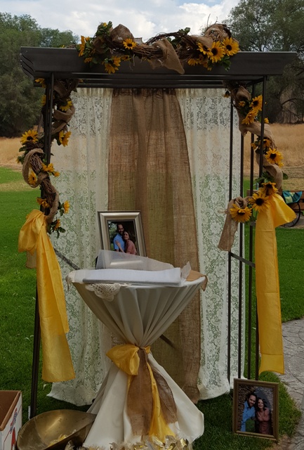 FMC Park Garden Wedding. Sunflowers and Burlap with Oak and Lace Backdrop.