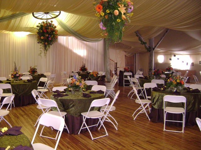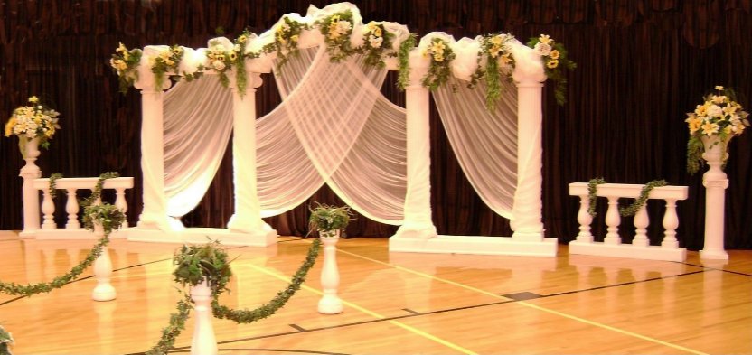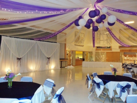 Beautiful wedding with black iron and lighted columns. Full ceiling and wall treatment by Pilar at Sa-Sys Elegant Settings.