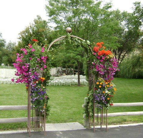Close up photo of the Garden Arbor and large flower bouquets on iron column stands.