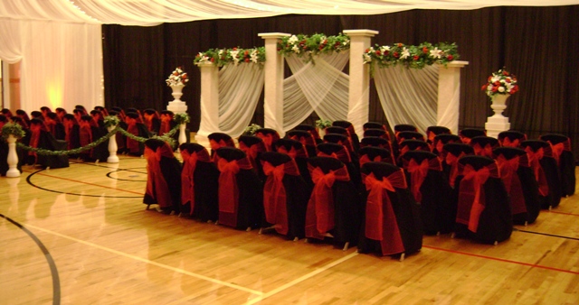 We carry a full line of tables, chairs, linens, chair covers, runners and overlays.